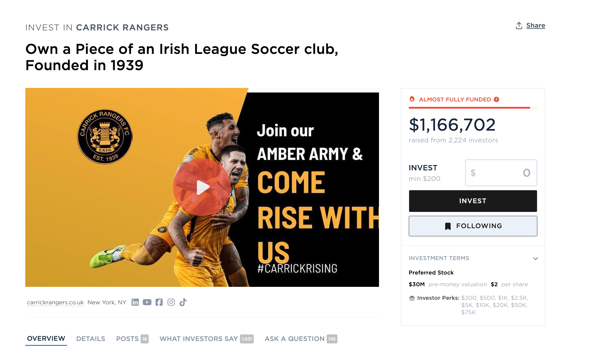We're talking about Carrick Rangers FC, one of Northern Ireland's most storied clubs, founded in 1939. And they did it all through a Reg CF crowdfunding campaign, with Space Funding running the playbook.