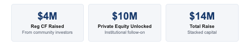 Here's where it gets interesting: that $4M raise — the community engagement, the public visibility, the demonstrated demand — was the signal that brought serious institutional players to the table. Private equity firms and top-tier institutional investors committed an additional $10 million, taking the total raise to $14 million combined.